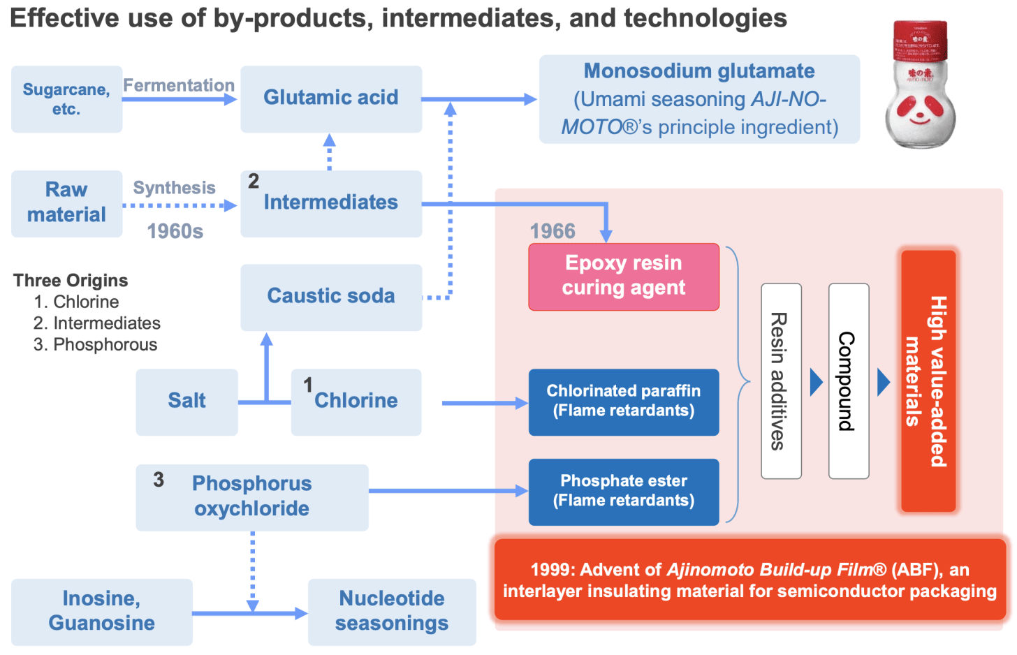 氫氧化鈉是從鹽轉化來的,而這個過程裡會多跑出氯。這些副產物後來竟然成了味之素跨界的起點。